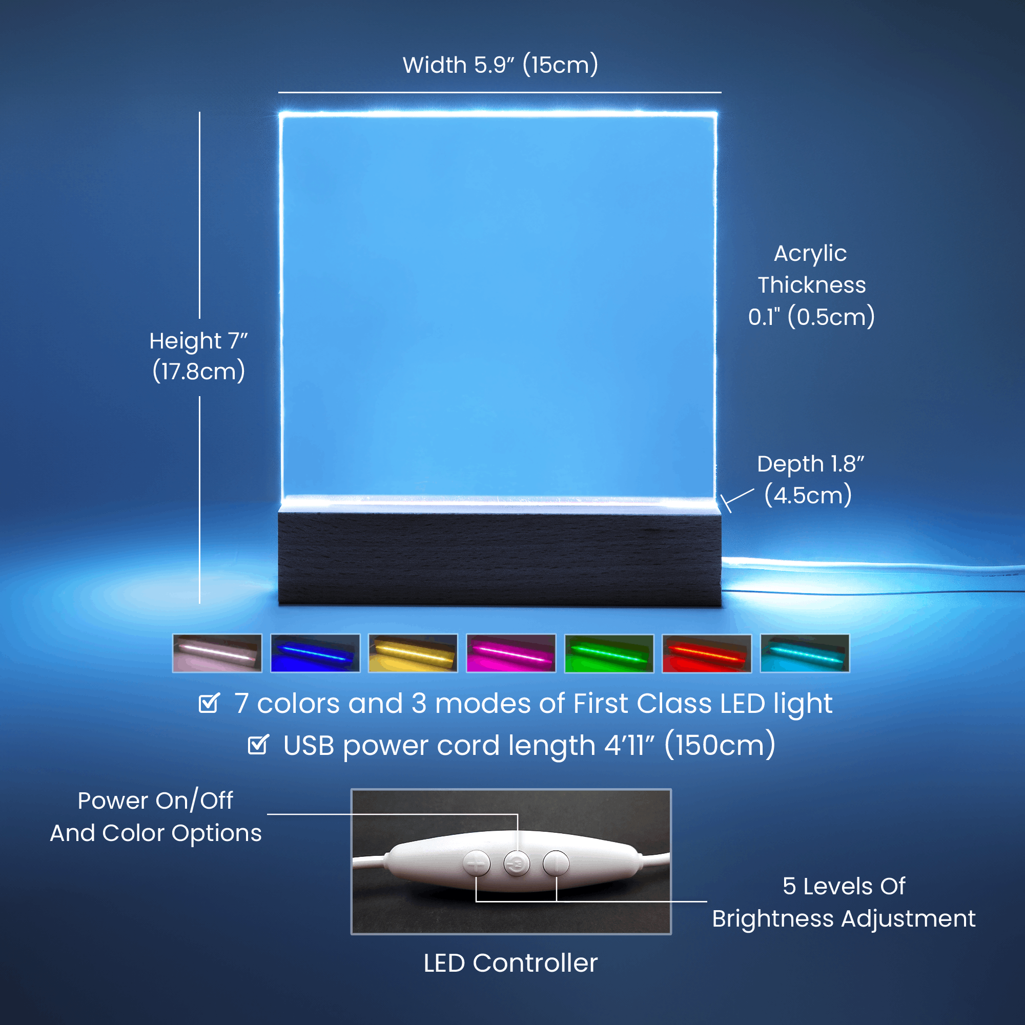 Your plaque will be crafted from premium acrylic with a professionally printed design for a polished look. It comes with a stylish wooden LED base, and you can choose between a USB plug-in option OR a cordless battery-operated option (requires 2 AAA batteries, not included). Both LED bases feature 7 vibrant colors, allowing the user to customize the lighting with various color changes and dynamic cycles.